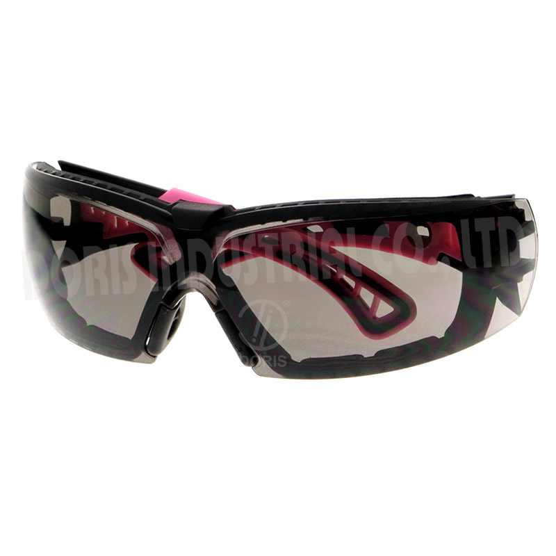 Extra-light safety spectacles with one piece wraparound polycarbonate lens, can be transformed into positive seal goggles when extra strap is attached on temples for stronger support, vented and removable eva foam insert to reduce fogging.. Anti-slippage dual-injected rubber feet.