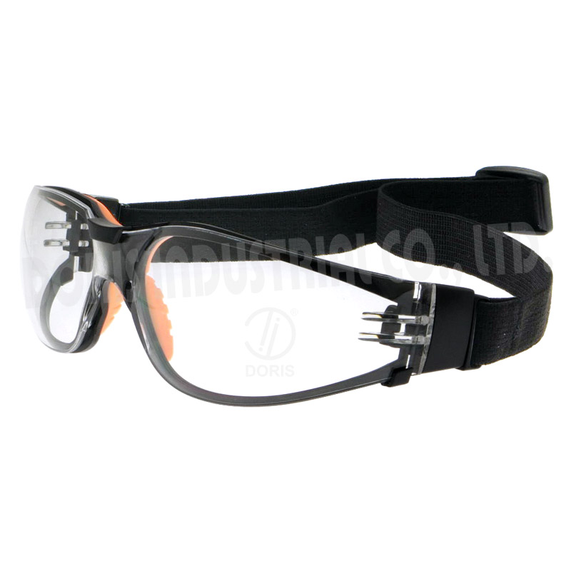 Industrial safety spectacles that incorporates temple / strap replacement function, can transform safety glasses into compact goggles or spoggle safety glasses, also known as sproggles. Easily removable dual injected inner frame. Double injected temple feet.