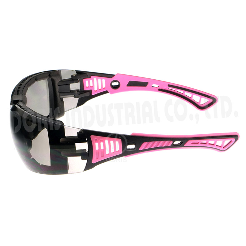 Strap attachment for secure, goggle-like fit, vented foam padding reduces fog and adds comfort, dual-material temples prevent slipping, ideal for high-movement or dusty environment.