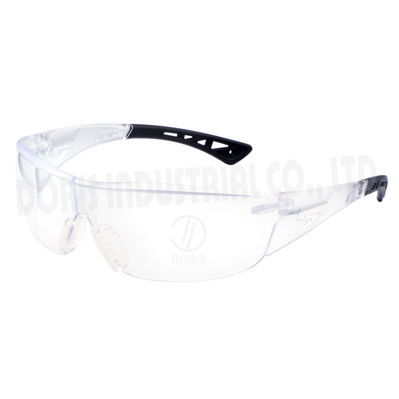 Clear one piece wrap around safety glasses, direct vented temples reduce fogging, side shield temples for better side protection, soft rubber nose pad for all day comfort.